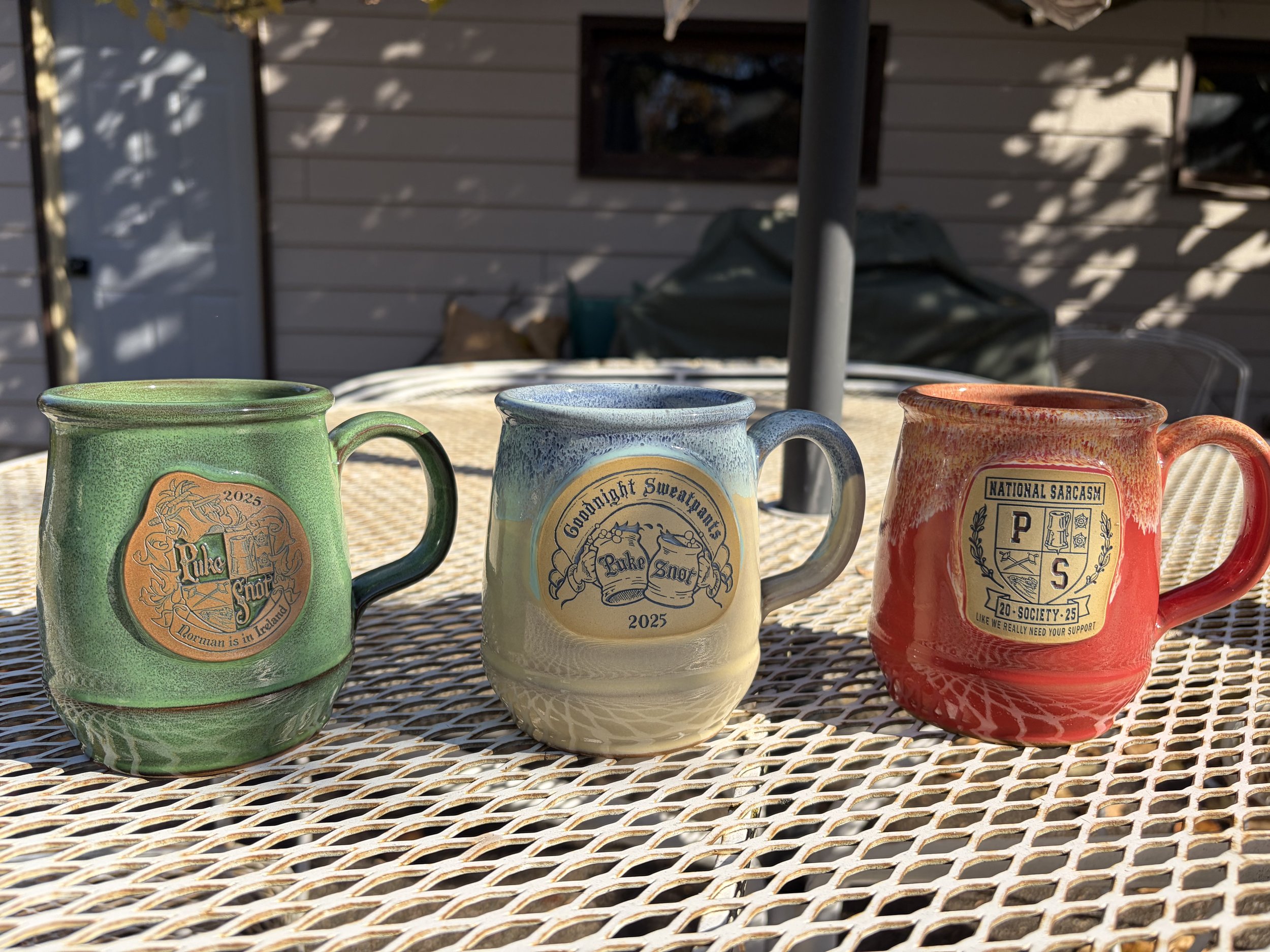 The first time we’re offering beautiful Puke & Snot pottery online! These gorgeous microwave and dishwasher safe tankards hold a can of beer with room left over, and they will also become your favorite coffee mugs. Hand-thrown by Deneen Pottery In St. Paul, these three come in JADE, BUTTER, and RED, each with their own individual coats of arms. Let us know which one(s) you want and we’ll ship them right out in time for Christmas.